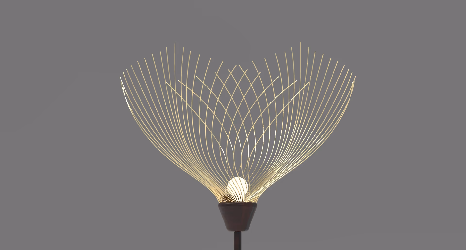 It means two lobes or two leaves, and is a standing and hanging luminaire design. The luminaire is interesting to see the different curved shapes of the interlocking lines at different angles.